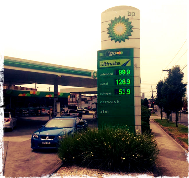 Melbourne. Record minimo del costo della benzina. Aud 0.99/litro uguale a 0.64euro/litro.