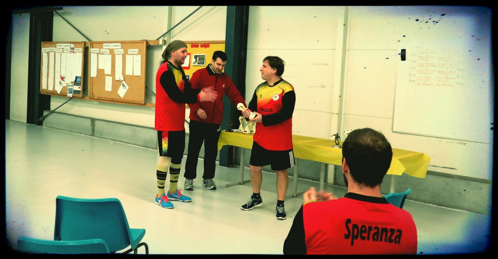 Il paziente difensore Toscano. – Nella squadra fin dagli inizi. Un campionato di calcetto vinto nel 2009 a Carlton e un secondo posto nel 2010 a calcio a 11 a Elwood, poi si rompe collaterale e menisco nel 2011 e va sotto i ferri col timore di non poter più giocare. Nel 2012 si fa convincere dai ragazzi del Somewhere a metter su una squadra di calcetto di Italiani e da lí tutto ha inizio. Jeff Turner allenatore della Toho di lui ha detto: – ha il sinistro di Recoba, il destro di uno zoppo e la corsa dei gemelli Filippini prima che scendano in campo -. Adesso del Chino ha solo le ginocchia doloranti anche se a volte riesce ancora a metterla proprio lí. Tiene la posizione di ultimo dietro con grande abnegazione tattica anche se questo gli costa qualche deviazione sfortunata che tende a spiazzare il proprio portiere. Da metà campionato riesce a spingere di più, cosa che lo porta a tirare ogni volta che vede la porta segnando goal importanti nel finale di stagione. Speechless. Voto 8